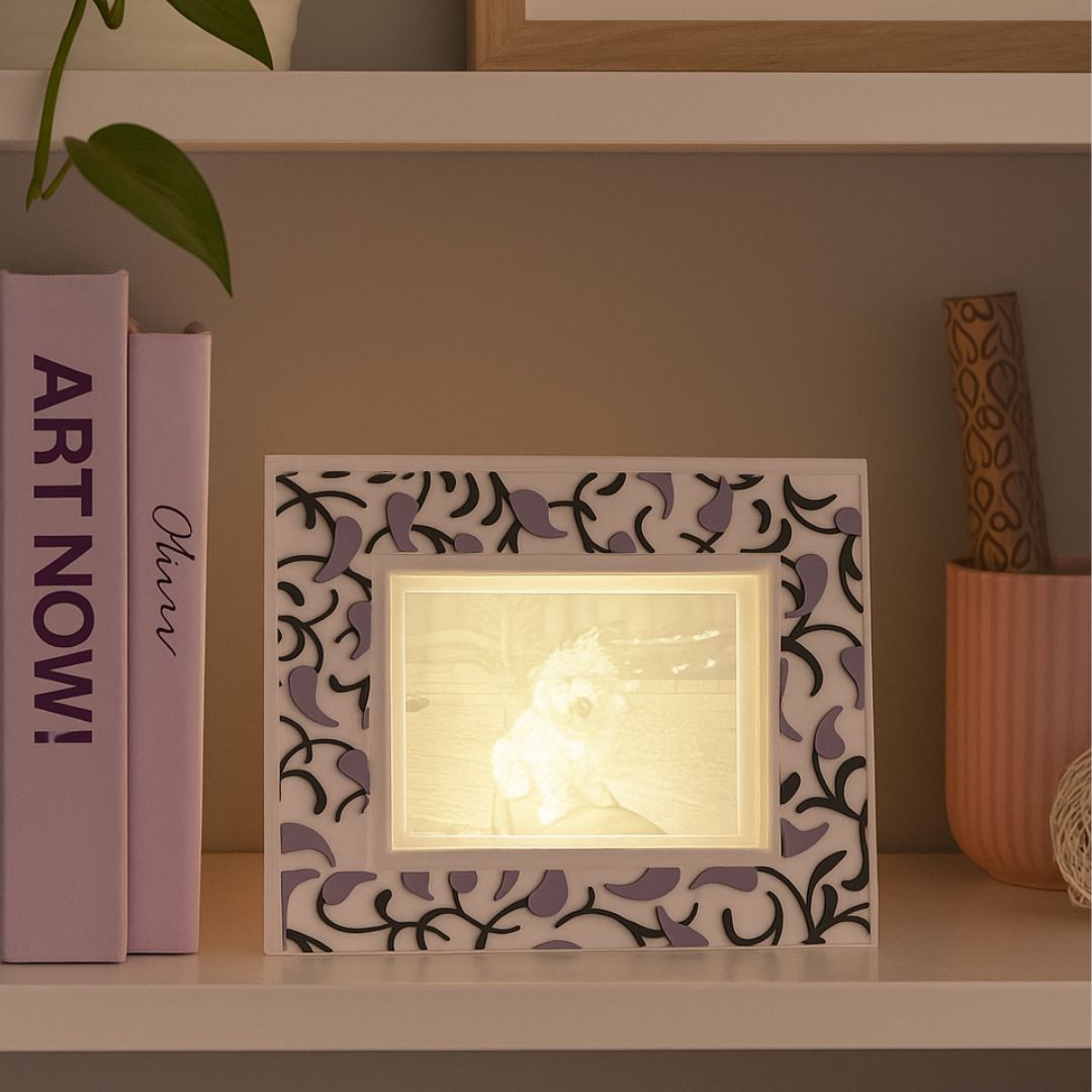 The Petal Charm Frame merges the timeless beauty of a floral motif with the soft, modern elegance of back-lit display. Inspired by blooming petals, its 3D-printed border forms a wreath-like pattern around a cherished photo. Place your image and watch it gently illuminateāevoking the serenity of floral arrangements with the comfort of a personal keepsake.Ā